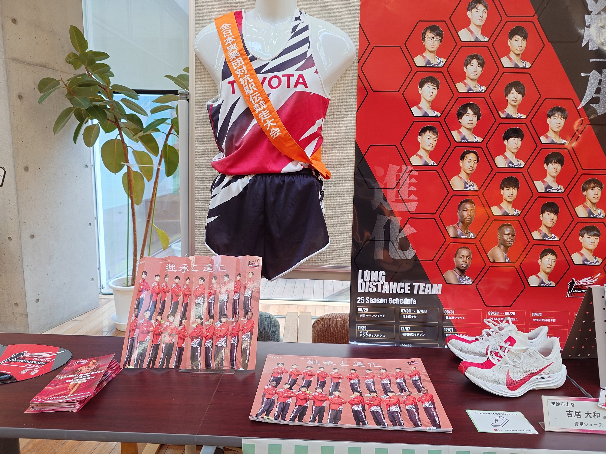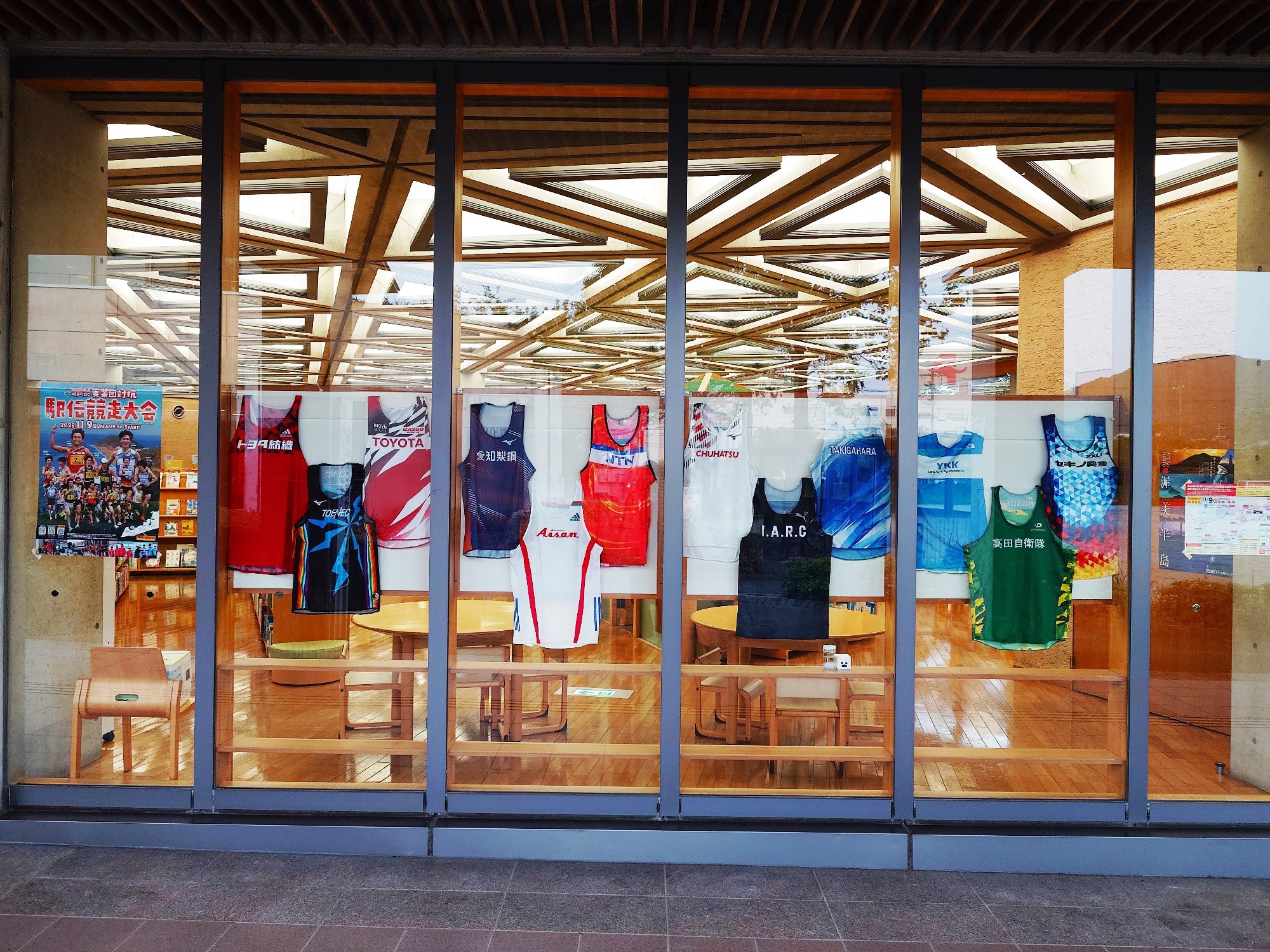 中央図書館のこどもしつガラス壁面では、第64回中部・第54回北陸実業団対抗駅伝競争大会の参加チームのユニフォームを展示しています。(〜11/9まで)