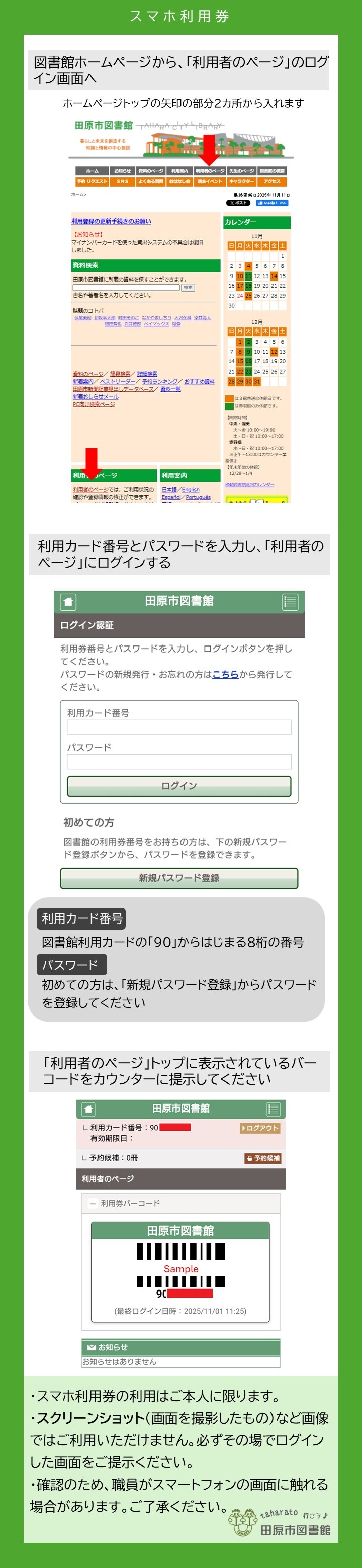 図書館システム機器の更新に合わせて、令和7年11月11日(火)からスマホ利用券サービスを始めました。図書館に来たけど利用カードを忘れてしまった時も、ご自身のスマートフォンで利用カード情報(バーコード)を表示し、貸出をすることができます。